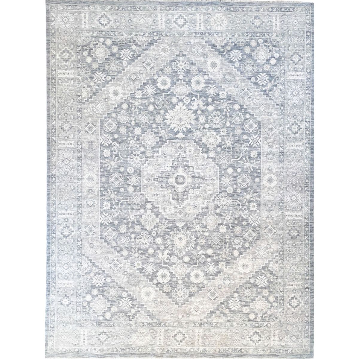 Vintage-inspired medallion rug in cool gray and silver. Intricate center medallion with a classic border and a softly distressed finish. Neutral, calm, and easy to style for living rooms, bedrooms, and dining areas.