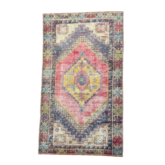 Add warmth and character to your space with this Handmade Vintage Wool Rug (3'3"x5'8"). Featuring a distressed tribal design in rich red, yellow, and earthy tones, this rug blends timeless style with cozy charm.
