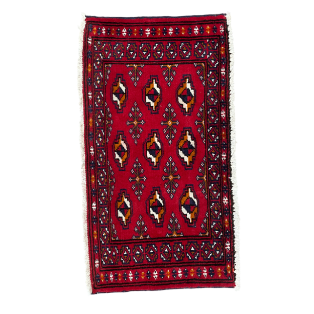 Enhance your space with this striking handmade wool accent rug, featuring a bold red background and intricate tribal-inspired patterns. Measuring 2' x 3'5" (24 inches x 41 inches), this small area rug is perfect for adding a splash of color to entryways, bedside areas, or any cozy corner. The geometric motifs in shades of red, black, ivory, and gold create a visually captivating design that complements both traditional and modern decor styles.This small area rug is a versatile piece that can be used to bring warmth, texture, and character to any space.