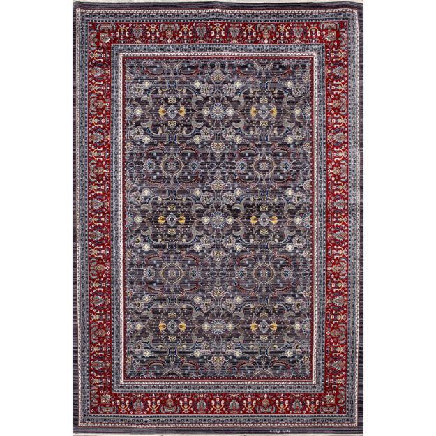 The Picasso Gray Izmir Rug with Red Border combines intricate floral and vine motifs with a rich color palette of deep gray, vibrant red, ivory, and gold accents, adding timeless elegance to any room.